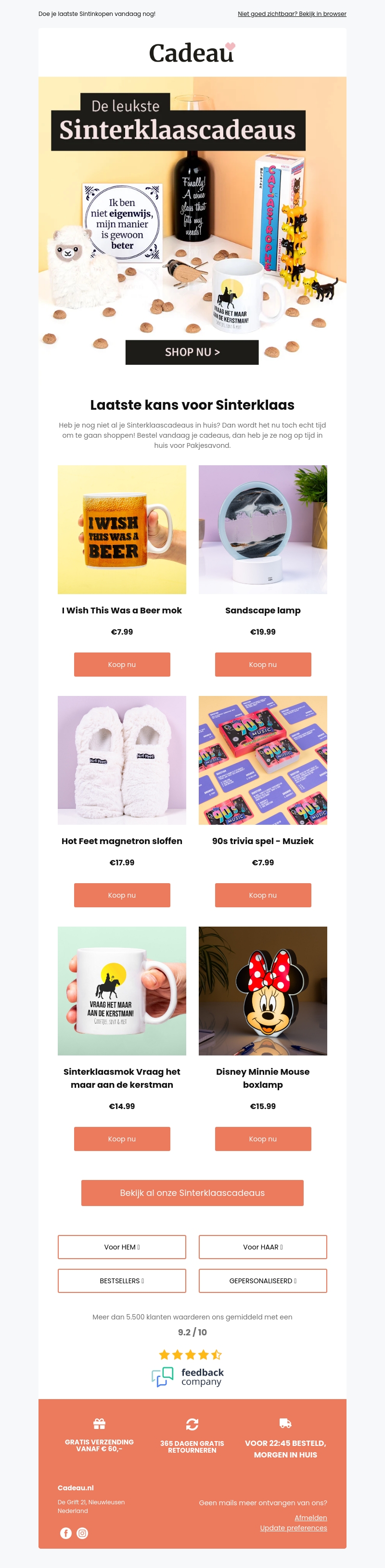 Ben je op zoek naar de perfecte Sinterklaascadeaus? Ontdek een breed scala aan unieke geschenken zoals mokken, lampen en spellen. Bestel nu en zorg ervoor dat je op tijd bent voor Pakjesavond. Mis deze laatste kans niet om de beste cadeaus in huis te halen!