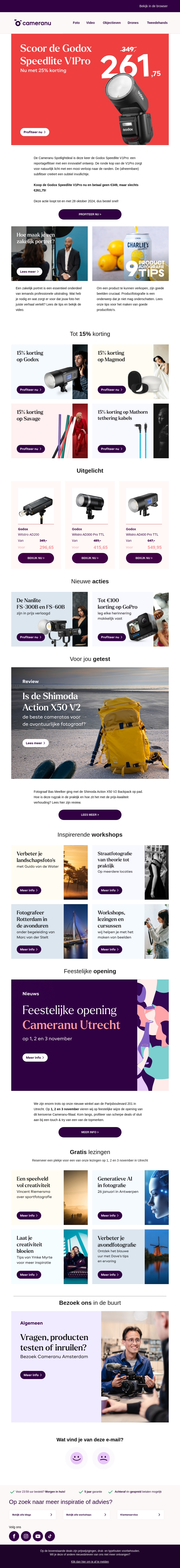 Ontdek de nieuwste aanbiedingen bij Cameranu met een exclusieve korting van 25% op de Godox Speedlite V1Pro. Met deze krachtige flitser verbetert u uw fotografiekwaliteit aanzienlijk. Bekijk ook andere kortingen, workshops, en nieuwe producten die uw interesse wekken.