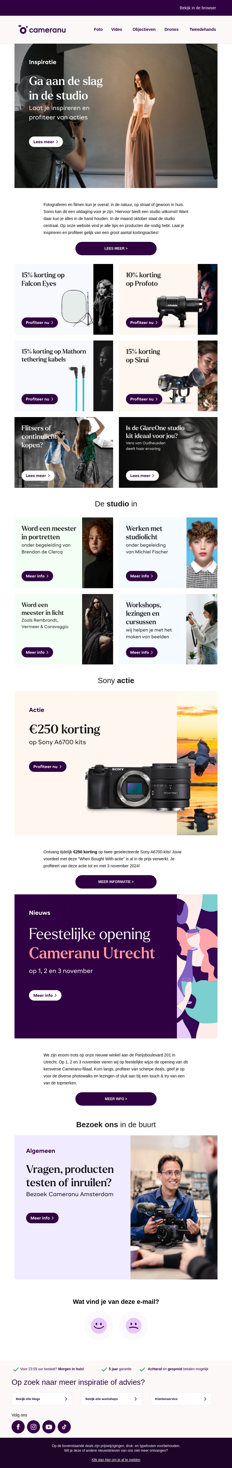 Maak gebruik van exclusieve kortingen op studioapparatuur bij Cameranu. Laat je inspireren door onze workshops en ontdek de voordelen van de nieuwste apparatuur. Bezoek onze feestelijke opening in Utrecht en krijg persoonlijk advies. Of je nu portretten wil fotograferen of je lichtmeester wil worden, wij hebben alles wat je nodig hebt.