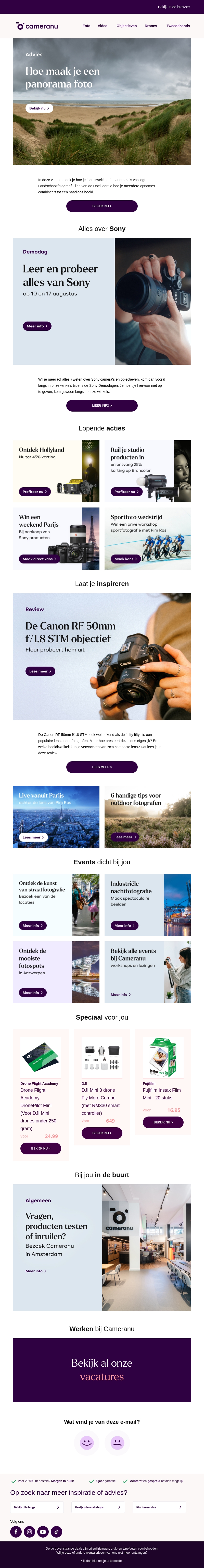 In deze nieuwsbrief ontdek je hoe je prachtige panoramafoto's kunt maken met behulp van eenvoudige stappen. Ook krijg je de kans om alles van Sony uit te proberen en kun je profiteren van lopende acties en evenementen. Verder lees je reviews over het Canon RF 50mm f/1.8 STM objectief en krijg je handige fotografietips. Bekijk snel de nieuwste aanbiedingen en inspirerende artikelen!
