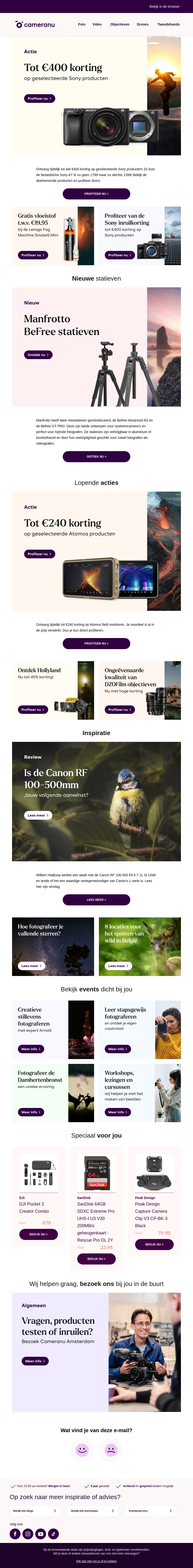Ontdek de nieuwste aanbiedingen op topmerken bij Cameranu met kortingen tot €400. Zoek naar deals op Sony producten, Manfrotto statieven, Atomos producten, en nog veel meer. Laat je inspireren door onze productselectie en haal alles wat je nodig hebt voor jouw fotografiereis.