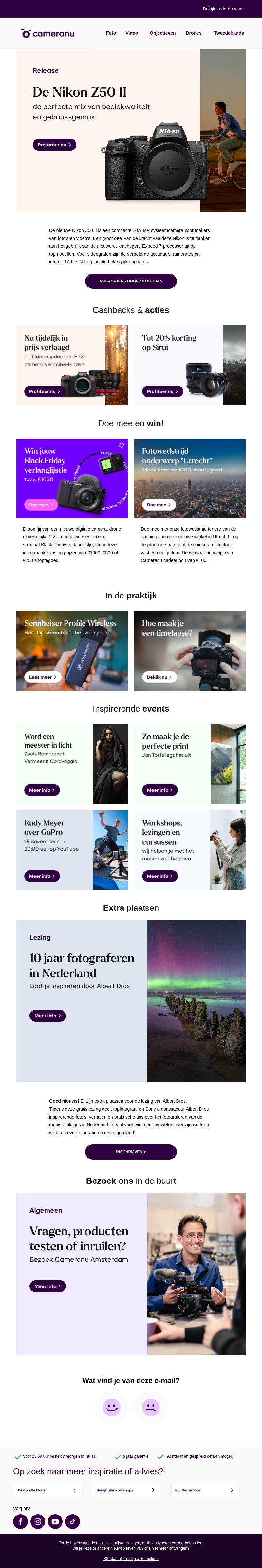 De Nikon Z50 II combineert uitstekende beeldkwaliteit met gebruiksgemak voor zowel amateurs als professionals. Nu beschikbaar voor pre-order bij Cameranu, inclusief mogelijkheden voor cashbacks en kortingen. Doe mee aan onze fotowedstrijd en win fantastische prijzen. Leer van inspirerende events en verruim je fotografievaardigheden. Bezoek Cameranu in Amsterdam voor persoonlijk advies.