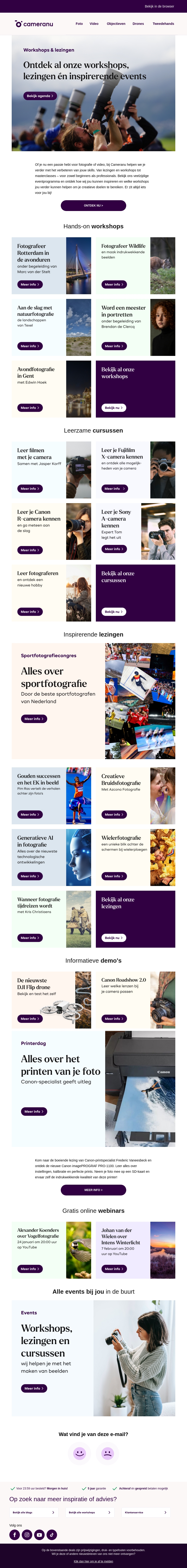 Verken een scala aan workshops, lezingen en demonstraties bij Cameranu. Of je nu een nieuwe camera wilt leren gebruiken of je fotografiekunsten wilt verbeteren, er is voor ieder wat wils. Neem deel aan inspirerende lezingen of probeer hands-on workshops. Mis deze unieke kans niet om meer te leren over jouw passie. Bekijk het volledige aanbod op onze website en schrijf je vandaag nog in!