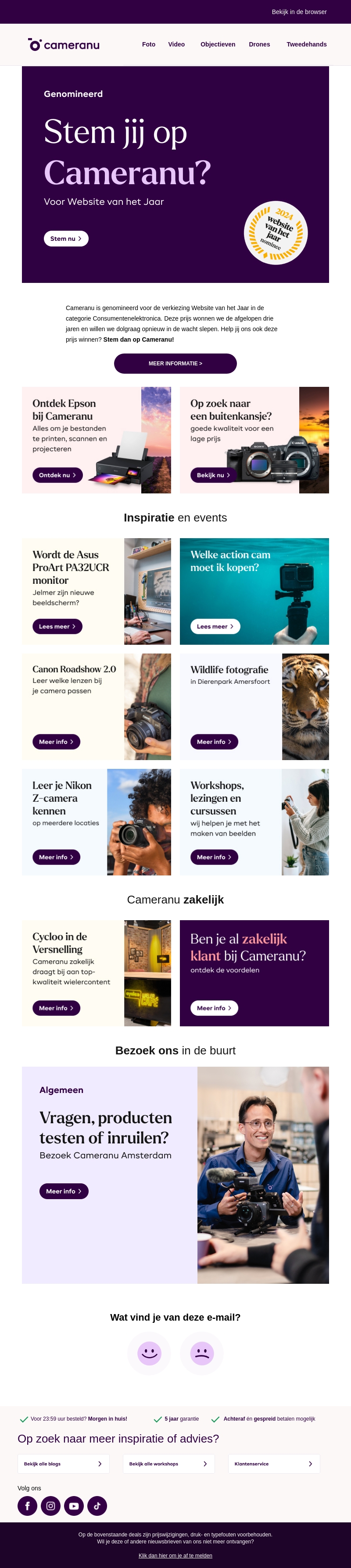 Cameranu is genomineerd voor de verkiezing van de Website van het Jaar in de categorie Consumentenelektronica. Mis onze nieuwste aanbiedingen en evenementen niet! Van workshops tot zakelijke oplossingen, ontdek alles wat Cameranu te bieden heeft.