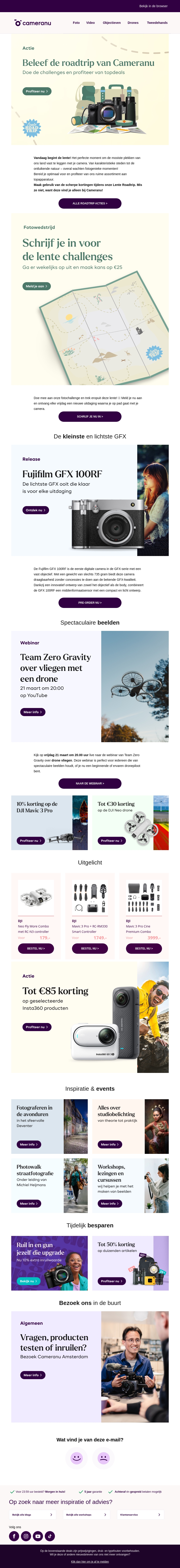 Beleef de Lente Roadtrip bij Cameranu met kortingen tot 50% op hoogwaardige camera-uitrusting. Doe mee aan uitdagende activiteiten en ontdek de nieuwste apparatuur, zoals de Fujifilm GFX 100RF en spannende webinars. Benut deze kans voor spectaculaire beelden en innovatieve technieken. Mis deze lente-uitdagingen niet!
