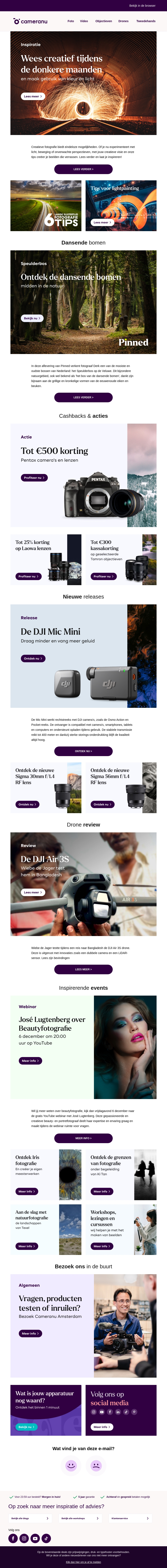 De donkere maanden zijn perfect om je creativiteit te verkennen met fotografie. In deze nieuwsbrief vind je tips om je fotografiekunst te verbeteren. Ontdek nieuwe producten zoals de DJI Mic Mini en de DJI Air 3S. Profiteer van kortingen tot €500 op lenzen. Volg webinars en events voor extra inspiratie.