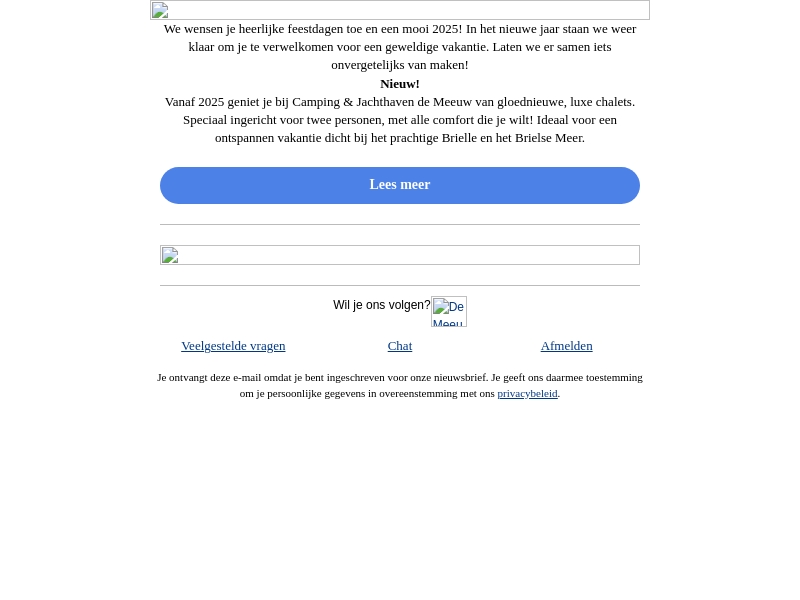 We wensen je fijne feestdagen en een geweldig 2025! Vanaf het nieuwe jaar kun je genieten van nieuwe luxe chalets bij Camping & Jachthaven de Meeuw. Speciaal voor twee personen, ingericht voor comfort en ontspanning in de buurt van het prachtige Brielle.