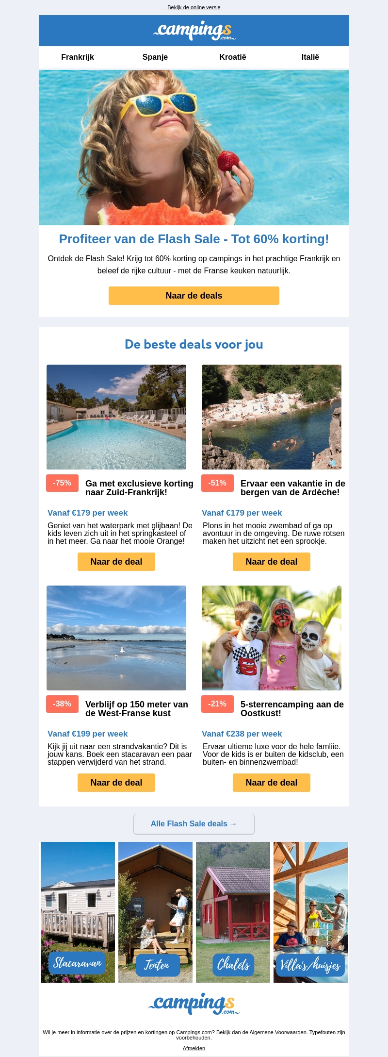 Ontdek de buitengewone Flash Sale met tot 60% korting op campings in Frankrijk. Ervaar de rijke Franse cultuur en geniet van heerlijke Franse gerechten terwijl je verblijft op een van de mooiste campings. Of je nu kiest voor een luxe 5-sterrencamping aan de Oostkust of een gezellige verblijfplaats dicht bij het strand, er is voor ieder wat wils. Grijp nu je kans en boek jouw voordelige vakantie in Frankrijk.