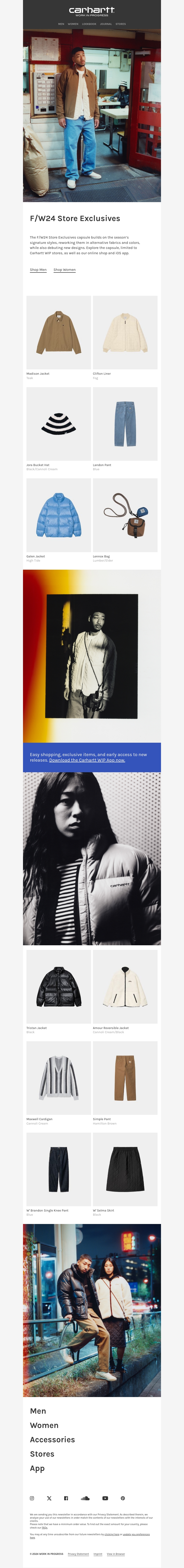 Beleef de F/W24 Store Exclusives van Carhartt. Deze collectie biedt een unieke selectie van stijlvolle, comfortabele kleding waarmee je jouw look kunt upgraden. Geniet van moderne ontwerpen en premium kwaliteit die speciaal zijn ontworpen voor het seizoen. Mis deze exclusieve stukken niet en ontdek nu jouw favorieten.