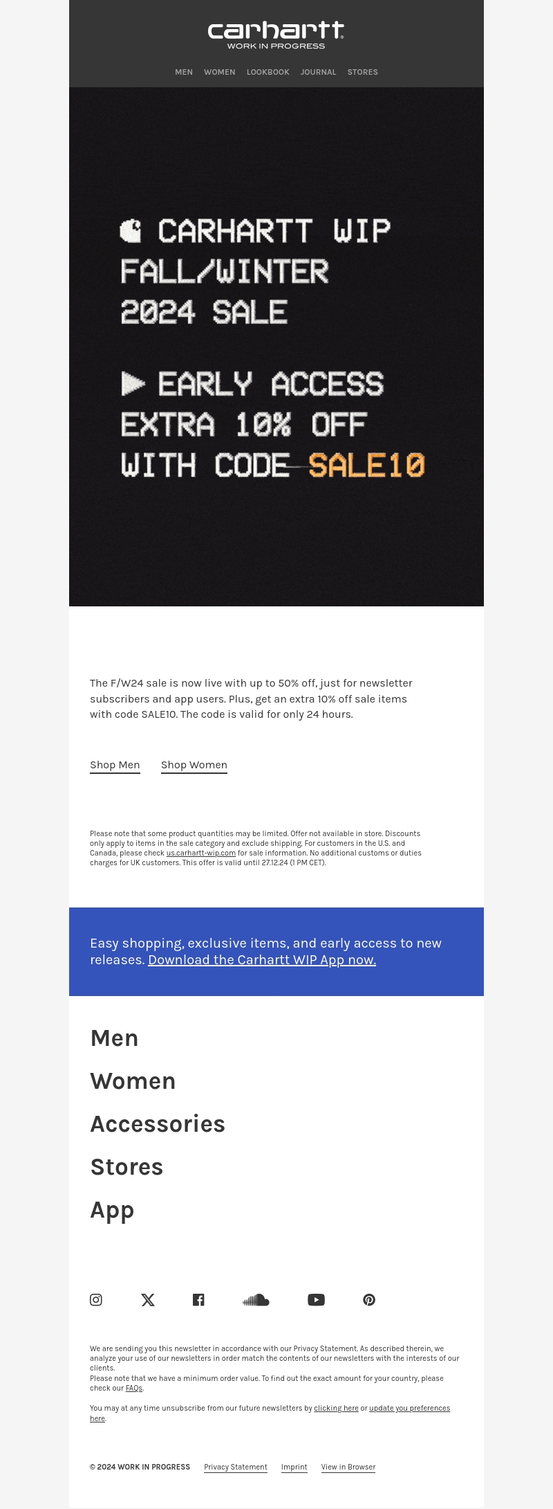 De Herfst/Winter 2024 uitverkoop van Carhartt WIP is gestart! Abonnees en app-gebruikers krijgen nu tot 50% korting. Profiteer van een extra 10% korting op afgeprijsde artikelen met de code SALE10. Maar wees snel, deze dealtjes duren slechts 24 uur.