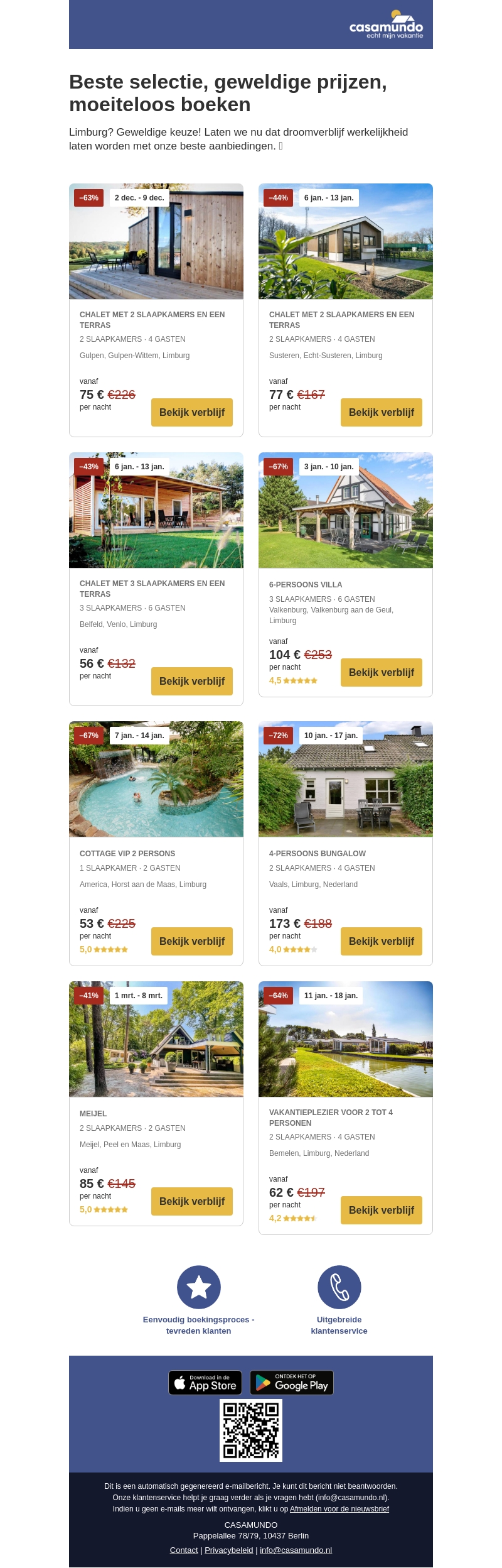 Maak uw droomvakantie in Limburg werkelijkheid met onze beste aanbiedingen. Van chalets tot villa's, er is voor ieder wat wils. Geniet van flinke kortingen tot wel 72%. Boek eenvoudig via ons platform en profiteer van uitstekende klantenservice. Begin vandaag nog met het plannen van uw volgende uitje.