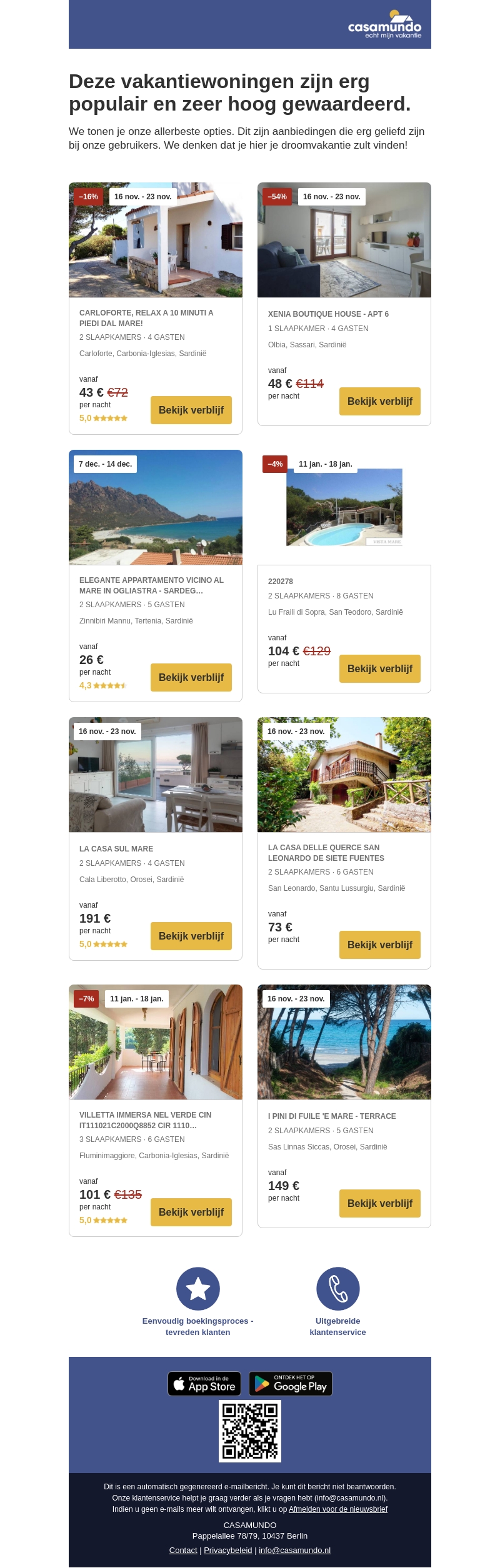 Ontsnap naar het prachtige Sardinië met geweldige kortingen op vakantieverblijven. Kies uit onze zorgvuldig geselecteerde topplekken. Van charmante villas tot moderne appartementen, deze deals zijn geliefd bij onze klanten. Boek nu en garandeer jezelf een onvergetelijke vakantie-ervaring. Perfect voor gezinnen en gezelschappen.