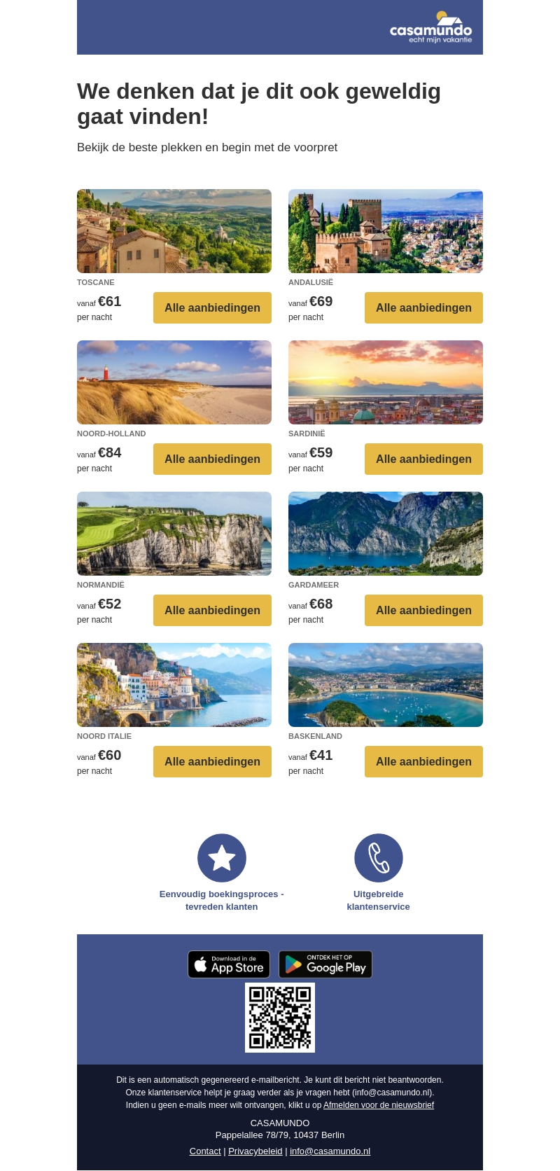 Begeef je op avontuur met Casamundo naar adembenemende bestemmingen zoals Toscane, AndalusiΓ« en SardiniΓ«. Ontdek geweldige deals vanaf slechts β¬41 per nacht. Eenvoudig boeken en uitstekende klantenservice staan voorop. Begin nu met het plannen van je volgende droomreis.