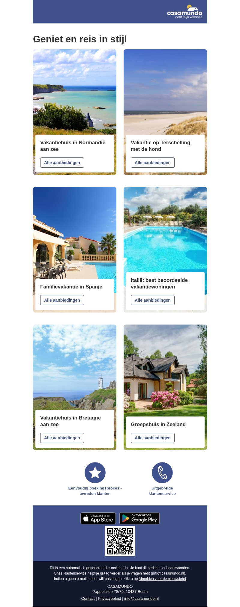 Deze nieuwsbrief van Casamundo biedt je de kans om te genieten van stijlvolle vakanties op prachtige bestemmingen. Van NormandiΓ« en Bretagne tot de zonovergoten stranden van Spanje en ItaliΓ«. Vergeet de drukte en beleef een rustige vakantie met de hele familie of je trouwe viervoeter.