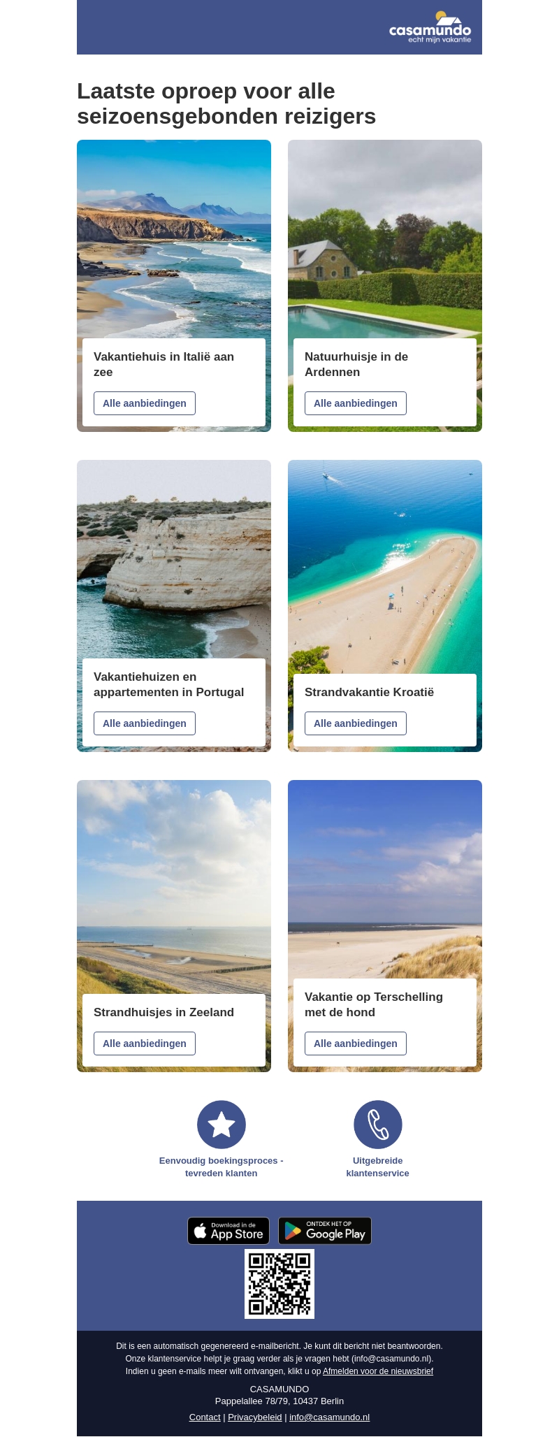 Deze nieuwsbrief van Casamundo biedt een overzicht van prachtige vakantiewoningen in Europa. Of je nu houdt van een vakantiehuis aan zee in ItaliΓ« of een natuurhuisje in de Ardennen, er is voor ieder wat wils. Verken de mogelijkheden in Portugal of kies voor een ontspannende strandvakantie in KroatiΓ«. Ontdek de rust in een strandhuisje in Zeeland of neem je hond mee naar Terschelling. Geniet van een eenvoudig boekingsproces en uitstekende klantenservice.