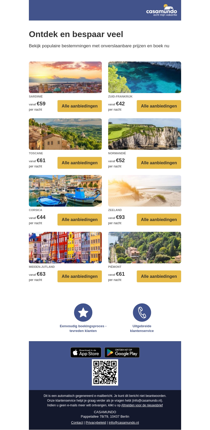 Verken de mooiste plekken met Casamundo's uitstekende aanbiedingen. Vind onvergetelijke ervaringen in SardiniΓ«, Toscane, NormandiΓ«, en meer. Boek nu met prijzen vanaf slechts β¬42 per nacht. Garandeer een makkelijk boekingsproces en een klantvriendelijke service. Ontsnap naar jouw droombestemming en creΓ«er blijvende herinneringen.