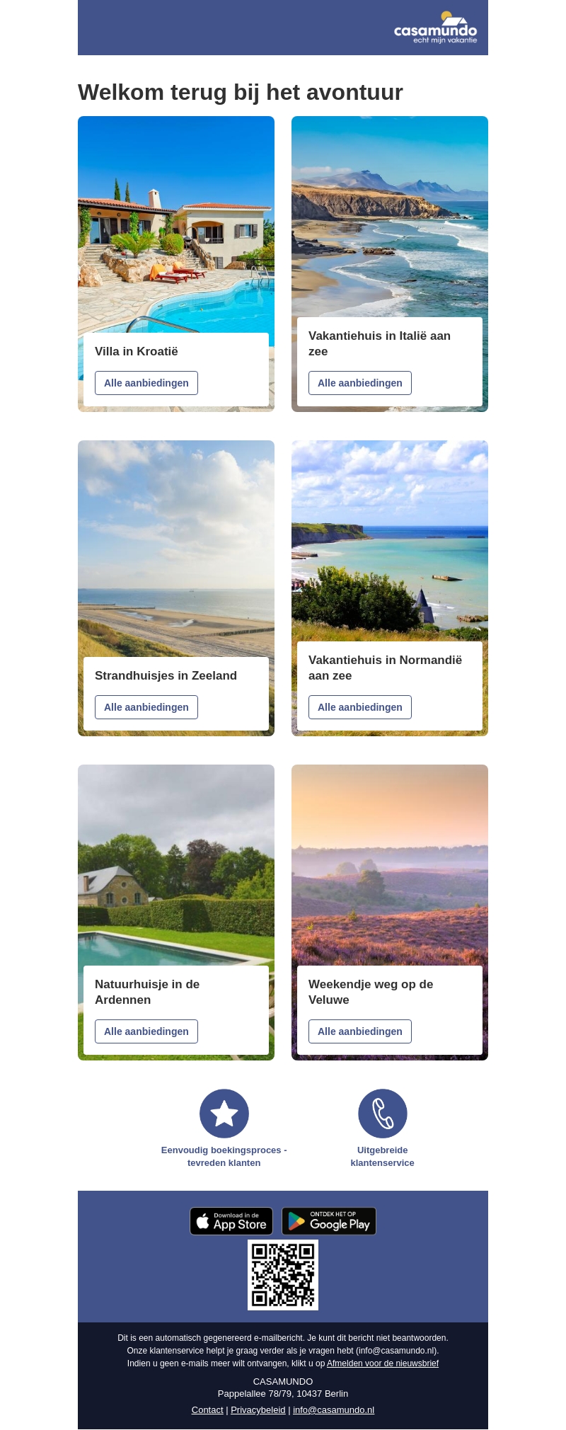Welkom terug bij het avontuur! Ontdek unieke vakantiebestemmingen zoals een villa in KroatiΓ« of een natuurhuisje in de Ardennen. Of je nu naar de zonovergoten stranden van ItaliΓ« wilt of een serene reis in de Veluwe zoekt, Casamundo heeft het allemaal. Laat je inspireren door prachtige locaties en geniet van een eenvoudig boekingsproces. Perfect voor een korte break of een uitgebreide vakantie. Bekijk alle aanbiedingen nu!