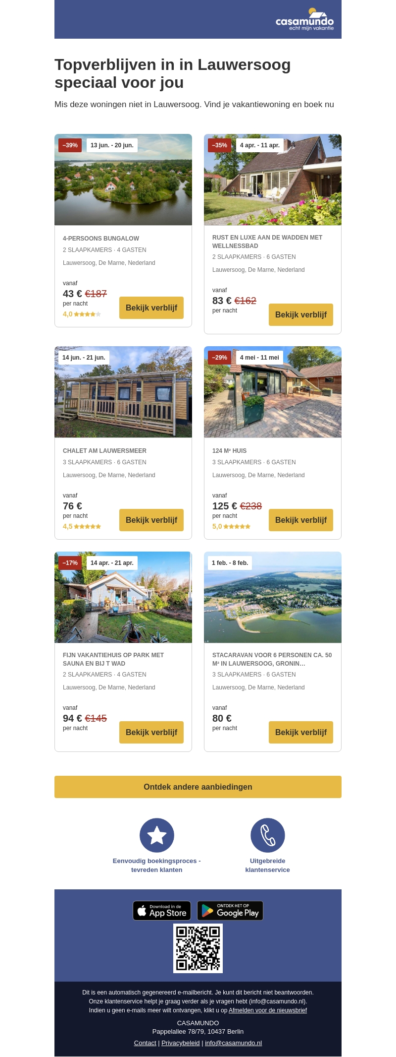 Mis deze kans niet om te verblijven in het prachtige Lauwersoog. Of je nu op zoek bent naar een ontspannende bungalow of een luxe huis met wellnessbad, er is voor ieder wat wils. Profiteer van kortingen tot 39% op geselecteerde woningen. Kies voor rust aan de Wadden of gezelligheid aan het Lauwersmeer. Boek nu en ervaar een onvergetelijke vakantie met Casamundo.