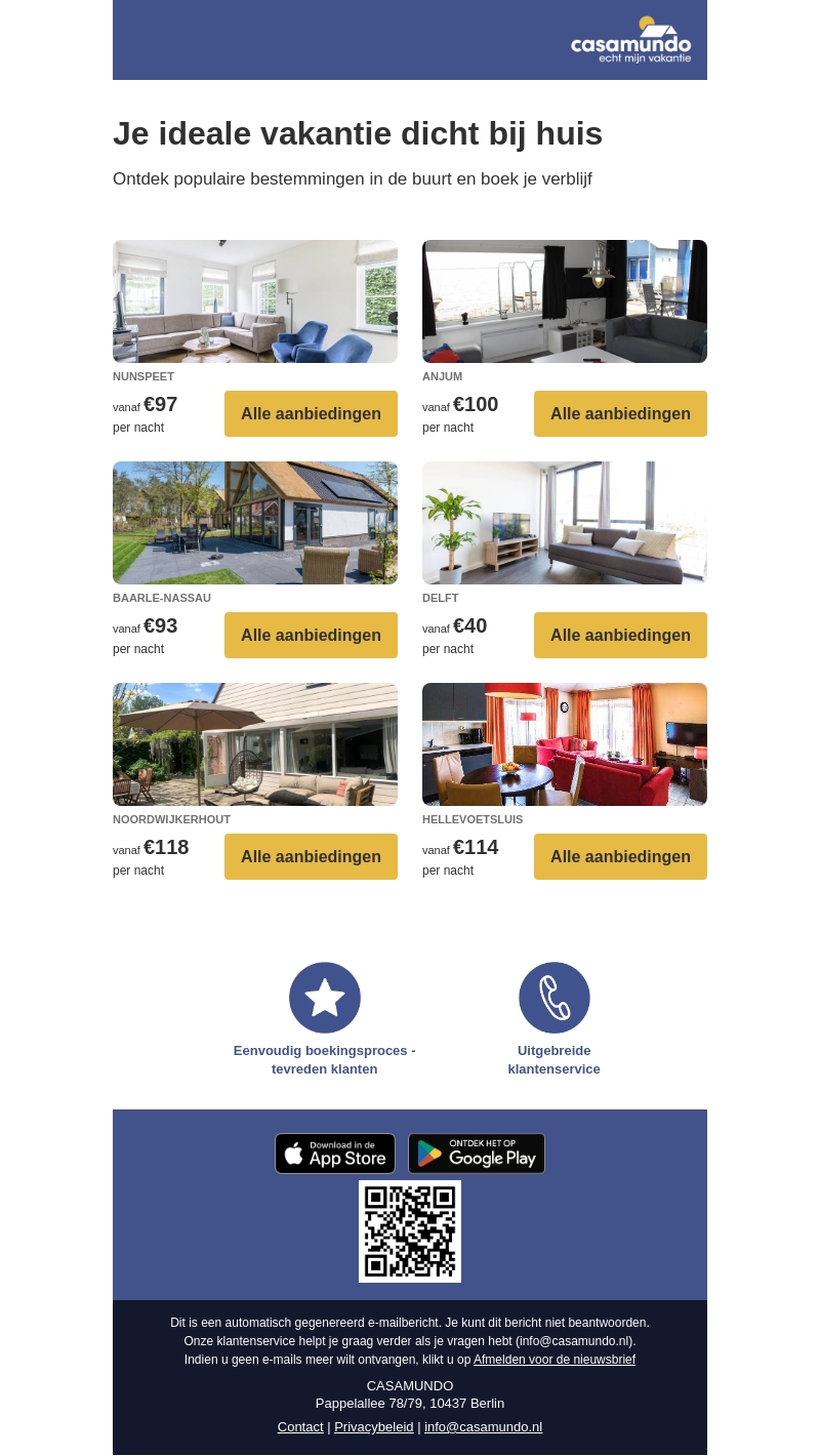 Ontsnap aan de drukte en ervaar een ontspannen vakantie in eigen land. Ontdek populaire bestemmingen zoals Nunspeet, Anjum, Delft, en meer. Geniet van een comfortabele accommodatie vanaf €40 per nacht. Met een eenvoudig boekingsproces en uitgebreide klantenservice staat niets je ideale uitje in de weg.