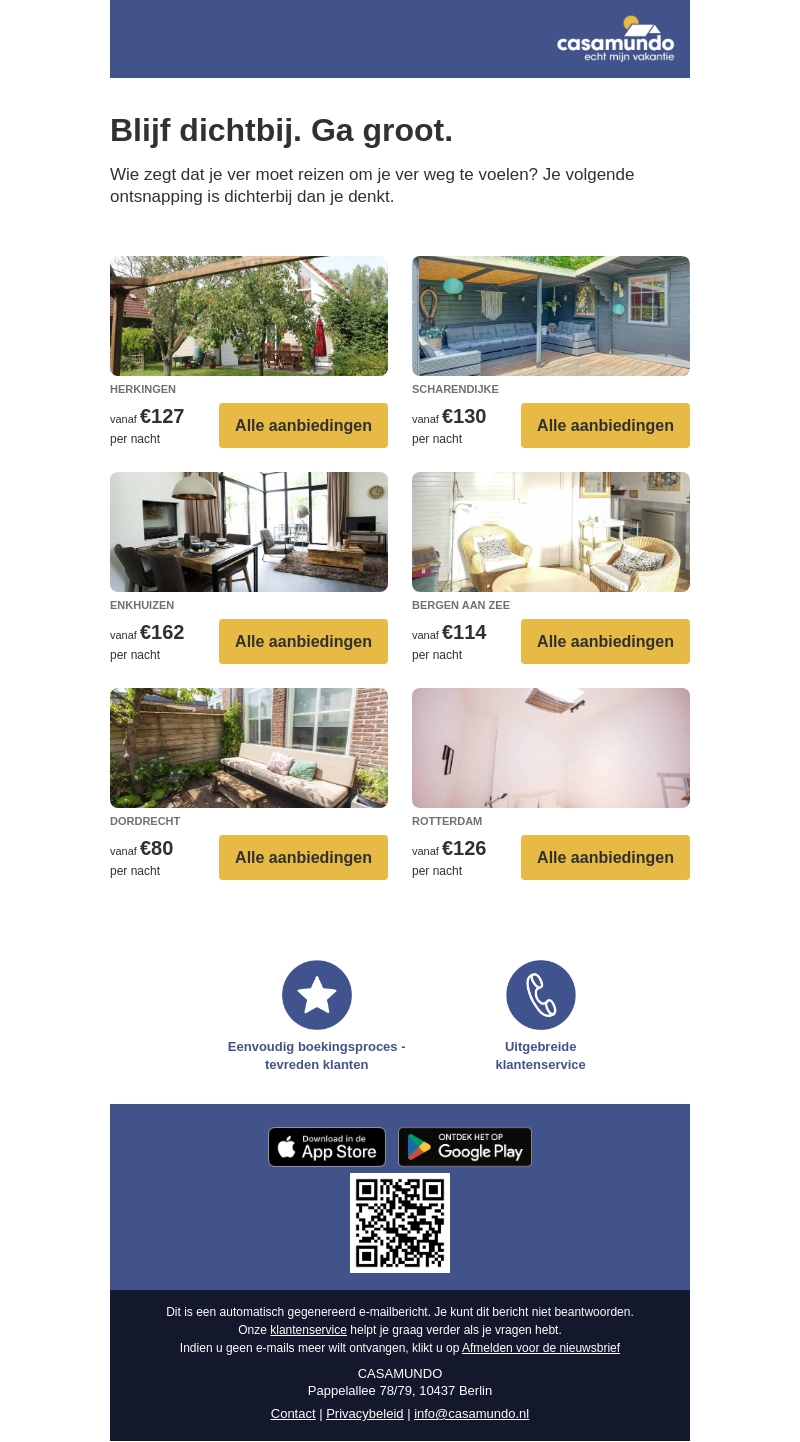 Waarom ver reizen als avontuur om de hoek ligt? Ontsnap aan de drukte met deze unieke lokale vakantiebestemmingen. Geniet van aanbiedingsprijzen bij een selectie van prachtige accommodaties. Of je nu een strandhuisje of een stadslodge zoekt, er is voor ieder wat wils. Begin jouw onvergetelijke reis dichterbij huis.