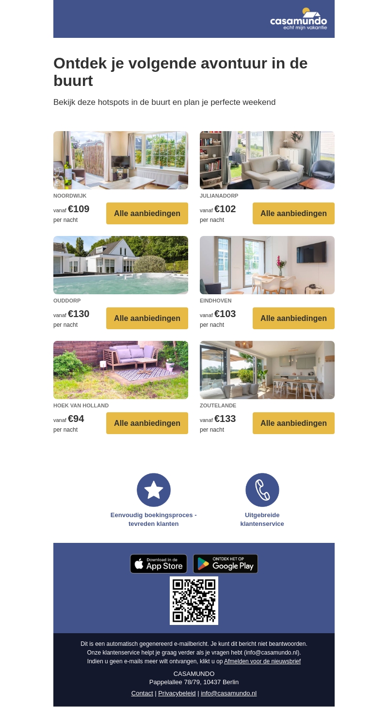 Beleef een heerlijke vakantie in eigen land met de beste aanbiedingen van Casamundo. Ontdek unieke bestemmingen zoals Noordwijk en Julianadorp voor een ontspannen uitje. Maak gebruik van het eenvoudige boekingsproces en ervaar uitstekende klantenservice. Verder biedt Casamundo comfortabele accommodaties voor betaalbare prijzen. Begin vandaag nog met het plannen van je volgende avontuur.