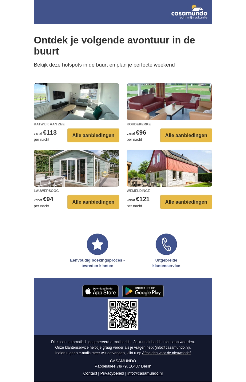Ontvlucht de dagelijkse sleur en ontdek nieuwe hotspots dicht bij huis. Met aanbiedingen vanaf €96 per nacht, biedt Casamundo je de kans om betaalbaar te genieten van een weekendje weg. Boek eenvoudig je verblijf en profiteer van uitstekende klantenservice. Kies uit diverse locaties zoals Katwijk aan Zee en Koudekerke voor een unieke ervaring.