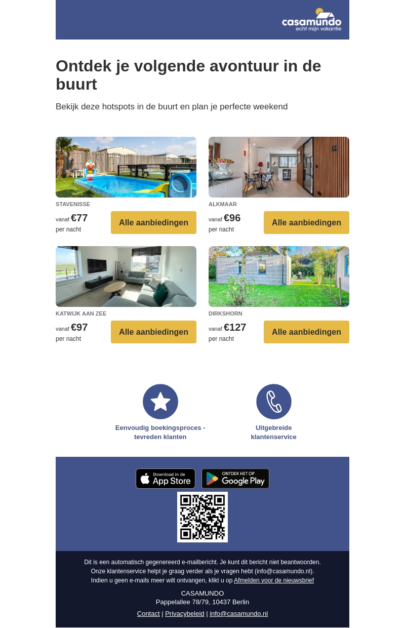 Ontdek je volgende avontuur met deze unieke weekenduitstapjes in jouw buurt. Verblijf in gezellige accommodaties in Stavenisse, Alkmaar, Katwijk aan Zee en Dirkshorn. Geniet van een eenvoudig boekingsproces en uitstekende klantenservice. Ervaar ontspanning en plezier voor de beste prijs.