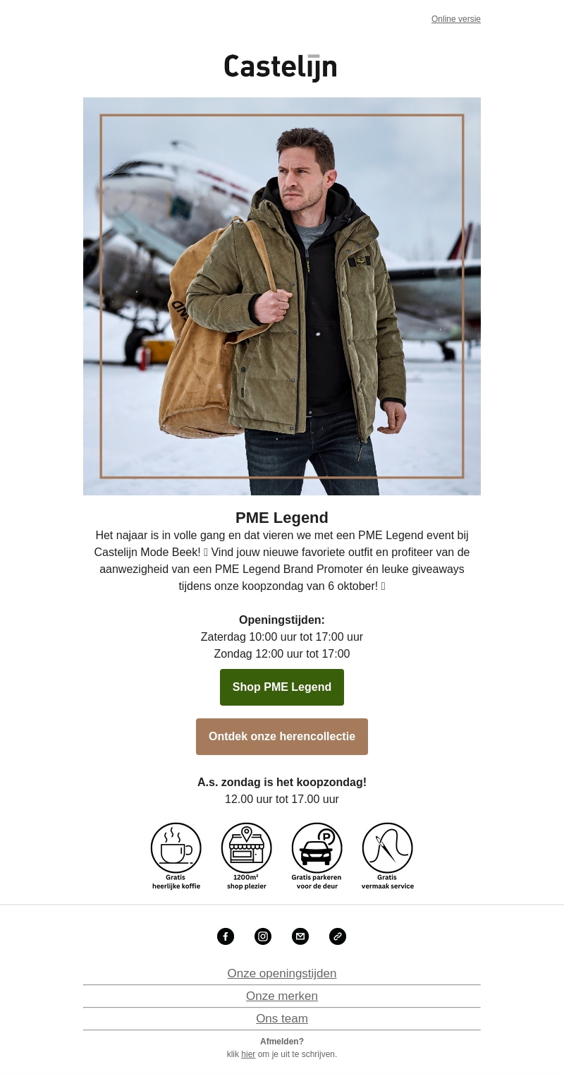 Het najaar is begonnen en dat vieren we met een speciaal PME Legend event bij Castelijn Mode Beek. Kom langs en ontdek jouw nieuwe favoriete outfit. Profiteer van de aanwezigheid van een PME Legend Brand Promoter en maak kans op leuke giveaways. Mis deze koopzondag op 6 oktober niet!