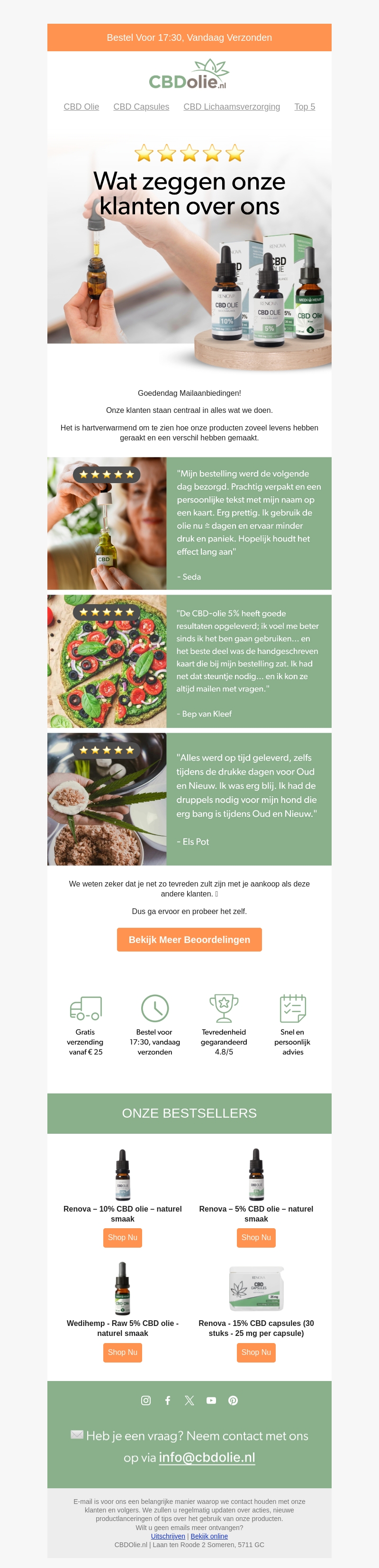 Bekijk de eerlijke recensies van onze tevreden klanten over de CBD producten. Ontdek hun ervaringen en zie hoe onze producten een verschil maken in hun leven. Bestel vandaag nog en ervaar het zelf.