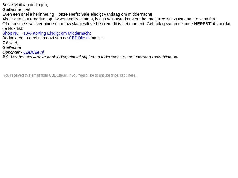 Beste Mailaanbiedingen, de herfst sale bij CBDOlie.nl eindigt vandaag. Profiteer nog snel van 10% korting op uw favoriete CBD-producten met code HERFST10. Mis deze kans niet!
