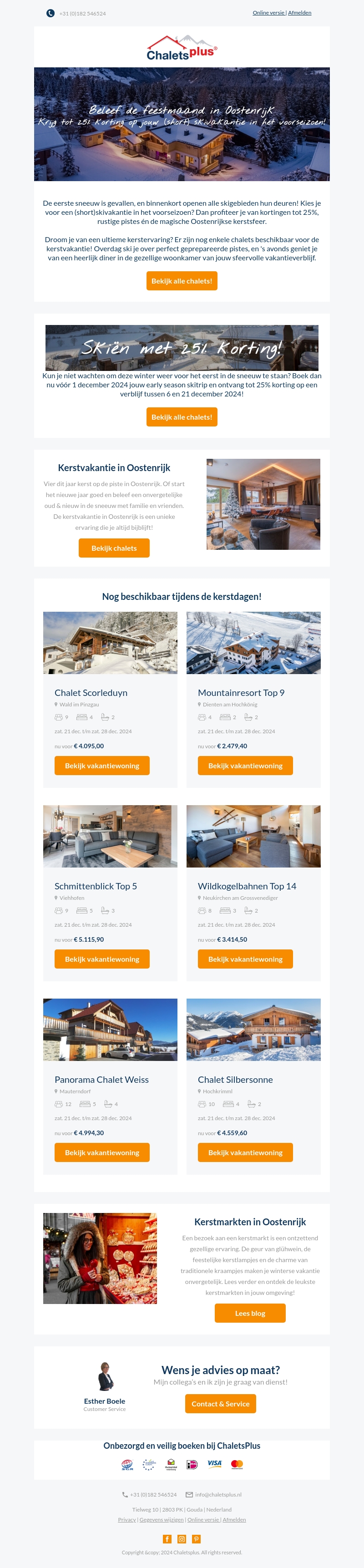 Geniet van een magische kerstvakantie in Oostenrijk met ChaletsPlus. Profiteer van tot wel 25% korting op uw verblijf in een van onze prachtige chalets. Ontdek de mooiste pistes en ervaar de gezellige kerstsfeer. Boek nu voor de beste deals en zorg voor een onvergetelijke vakantie.