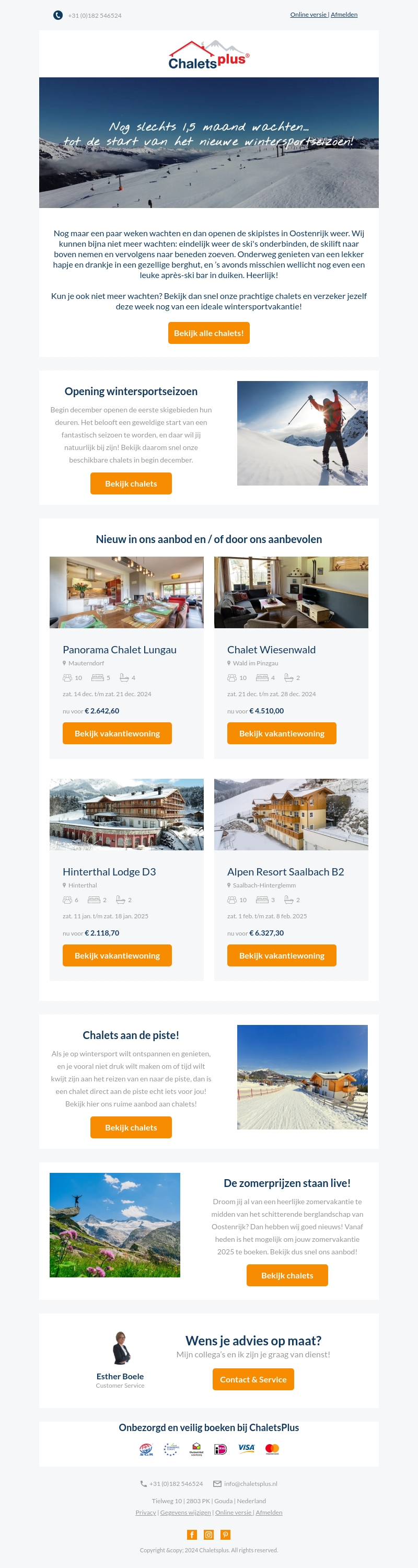 Nog maar even wachten en de skigebieden in Oostenrijk openen weer hun deuren. ChaletsPlus biedt een selectie van prachtige chalets aan voor een onvergetelijke wintersportervaring. Bekijk ons aanbod en bereid je voor op een geweldige tijd op de piste. Reserveer nu en verzeker jezelf van een plek in een van onze accommodaties.