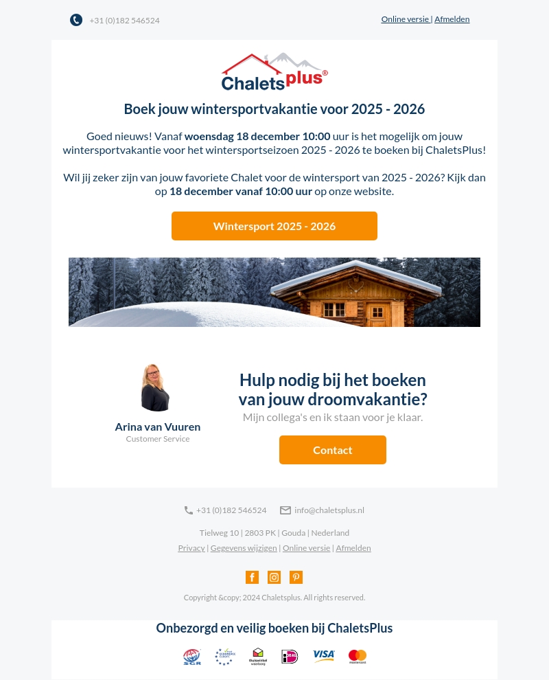 Goed nieuws! Vanaf 18 december 10:00 uur kun je jouw wintersportvakantie voor 2025-2026 boeken bij ChaletsPlus. Zorg ervoor dat je favoriete chalet beschikbaar is voor jouw droomvakantie. Boek vroeg om te genieten van een zorgeloze ervaring met ChaletsPlus.