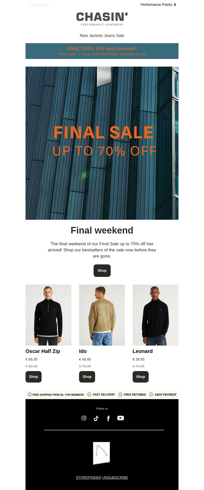 Discover incredible discounts with our Final Sale, offering up to 70% off on selected items. This is the perfect opportunity to update your wardrobe with our best-selling jeans. Enjoy additional 10% off on purchases over €100. Don't delay, these deals are for a limited time only. Fast delivery and free returns are available for a hassle-free shopping experience.