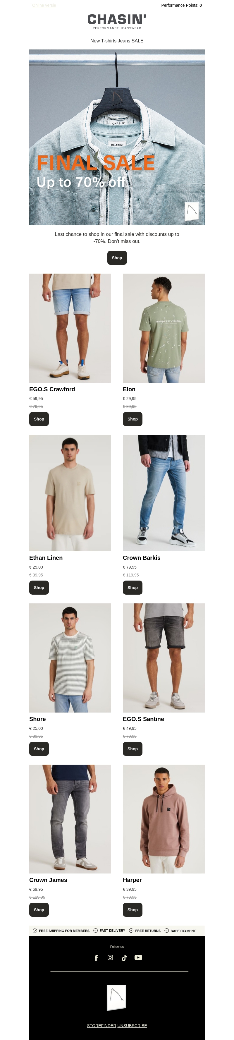 De finale uitverkoop bij CHASIN' eindigt vanavond. Profiteer van kortingen tot wel 70% op een breed assortiment aan jeans, shirts en meer. Mis het niet!