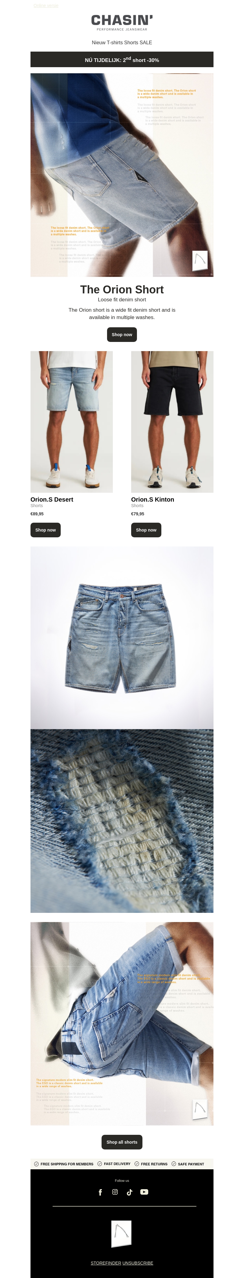 Maak kennis met de Orion Short van Chasin', een must-have voor je zomergarderobe. Deze loose fit denim shorts zijn nu verkrijgbaar in verschillende wassingen. Profiteer tijdelijk van 30% korting op je tweede short. Ideaal voor casual en trendy looks. Beschikbaar in de varianten Orion.S Desert en Orion.S Kinton.