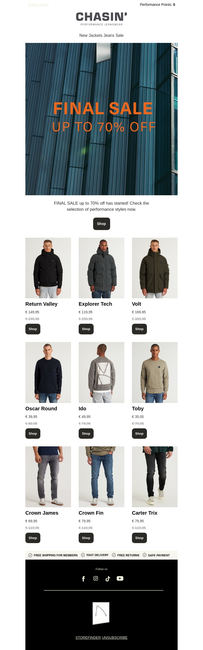 Duik in de final sale van Chasin' met kortingen tot wel 70% op onze premium jassen en jeans! Verken stijlvolle opties zoals de Return Valley of de Explorer Tech voor een fractie van de prijs. Profiteer van gratis verzending voor leden en snelle leveringen. Beperkte voorraad, dus wees er snel bij. Bekijk nu onze selectie en vernieuw je garderobe met topkwaliteit stukken.