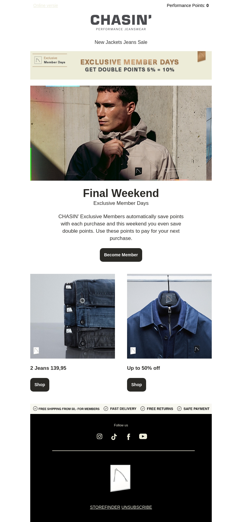 Dit weekend biedt CHASIN' een speciale aanbieding voor haar exclusieve leden. Geniet van dubbele punten bij elke aankoop, waardoor 5% omgezet wordt naar 10%! Dit is de perfecte gelegenheid om je punten te gebruiken voor toekomstige aankopen. Bekijk de nieuwste jeans en jassen met kortingen tot 50%. Word nu lid en profiteer van deze uitzonderlijke voordelen.