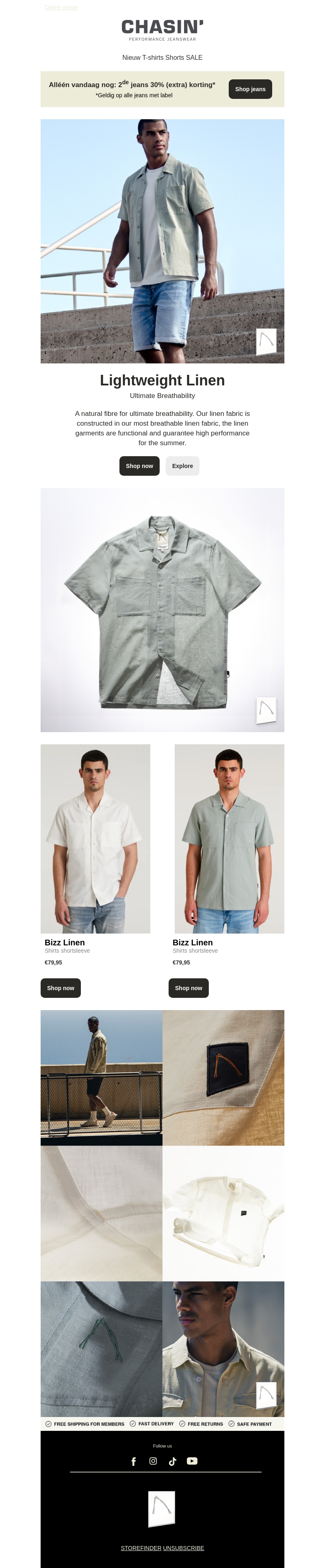 Bekijk de nieuwste lichtgewicht linnen collectie van Chasin'. Perfect voor een ademend en comfortabel zomeroutfit. Profiteer alleen vandaag van 30% korting op de 2e jeans. Ontdek meer over onze duurzame en stijlvolle kledingopties voor deze zomer.