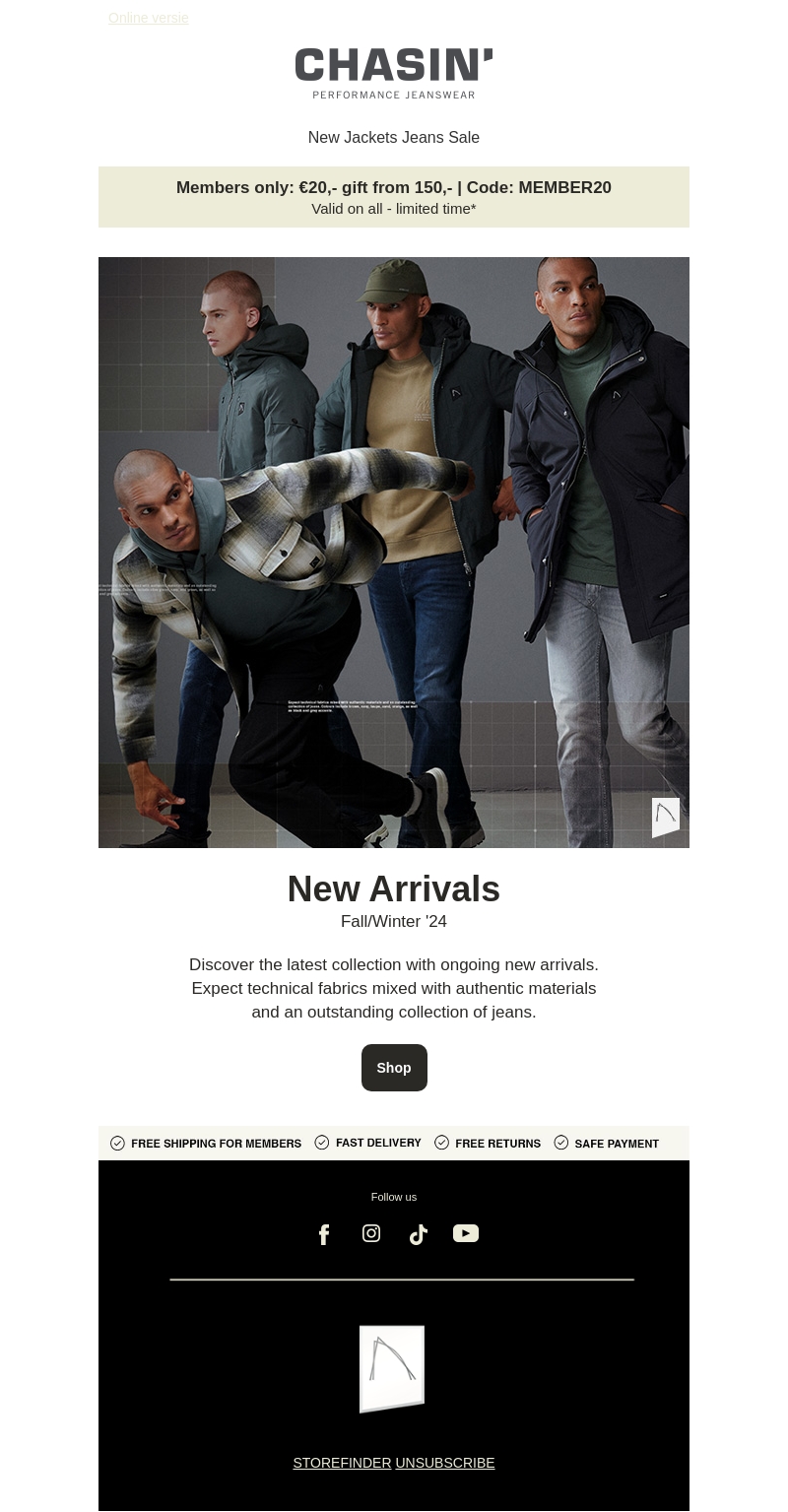 Duik in de nieuwste modecollectie voor Herfst/Winter '24 van CHASIN'. Ontdek stijlvolle jassen en authentieke jeans vervaardigd uit technische stoffen. Exclusief voor leden: ontvang €20 korting bij besteding van €150 met de code MEMBER20. Geniet van gratis verzending en snelle levering bij elke aankoop. Uitstekende kwaliteit en comfort gegarandeerd!