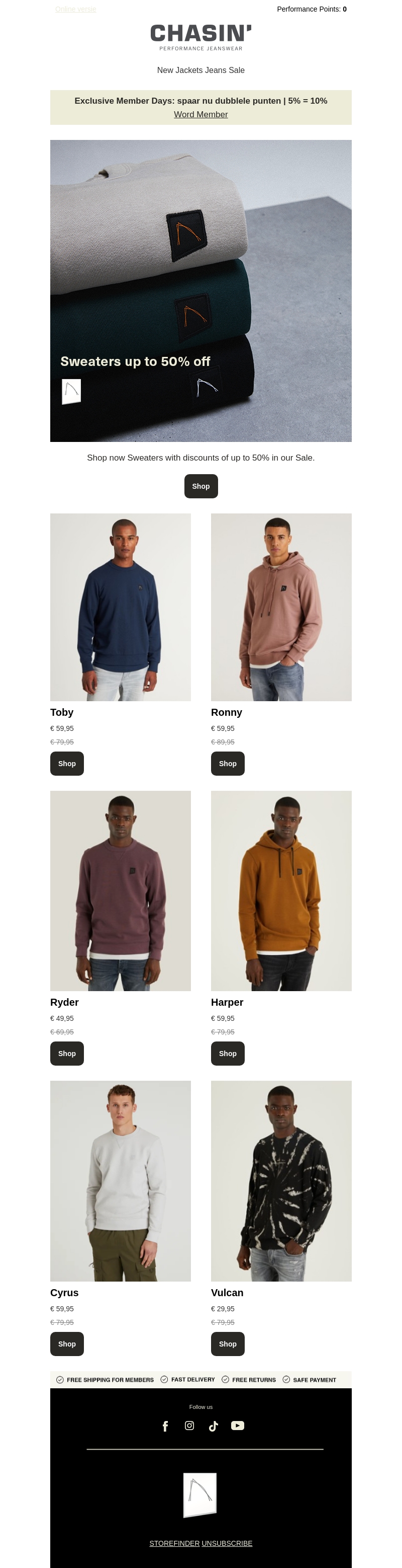 Mis deze geweldige kans niet! CHASIN' biedt nu tot 50% korting op een breed scala aan stijlvolle truien. Van klassiek navy tot trendy tie-dye, er is voor ieder wat wils. Verder genieten leden van exclusieve kortingen en dubbele punten. Ga nu naar de webshop en shop jouw favorieten!