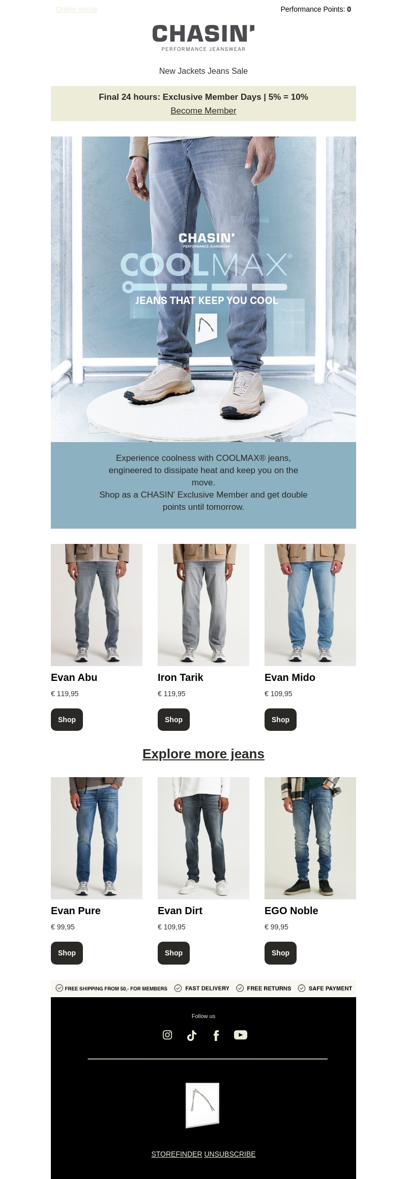 Blijf koel en comfortabel met de nieuwe COOLMAX® jeans van CHASIN'. Speciaal ontworpen om warmte af te voeren, perfect voor een actieve lente. Word exclusief lid voor dubbele punten en profiteer van extra korting. De collectie biedt diverse stijlen zoals Evan Abu en Iron Tarik. Mis deze kans niet om je garderobe te vernieuwen. Shop nu en ontvang gratis verzending vanaf €50.