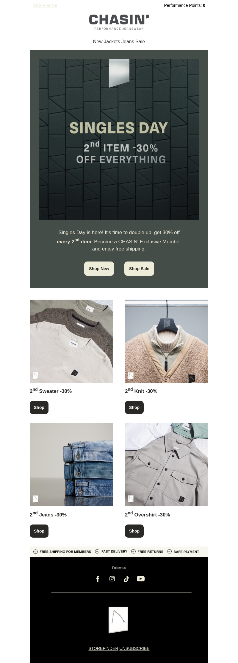 Vier Singles Day met geweldige kortingen bij CHASIN'. Ontvang 30% korting op elk tweede item dat je koopt. Mis deze kans niet om je garderobe aan te vullen met nieuwe kleding, waaronder truien en jeans. Schrijf je in als CHASIN' Exclusive Member en geniet van gratis verzending. Winkelen was nog nooit zo aantrekkelijk!