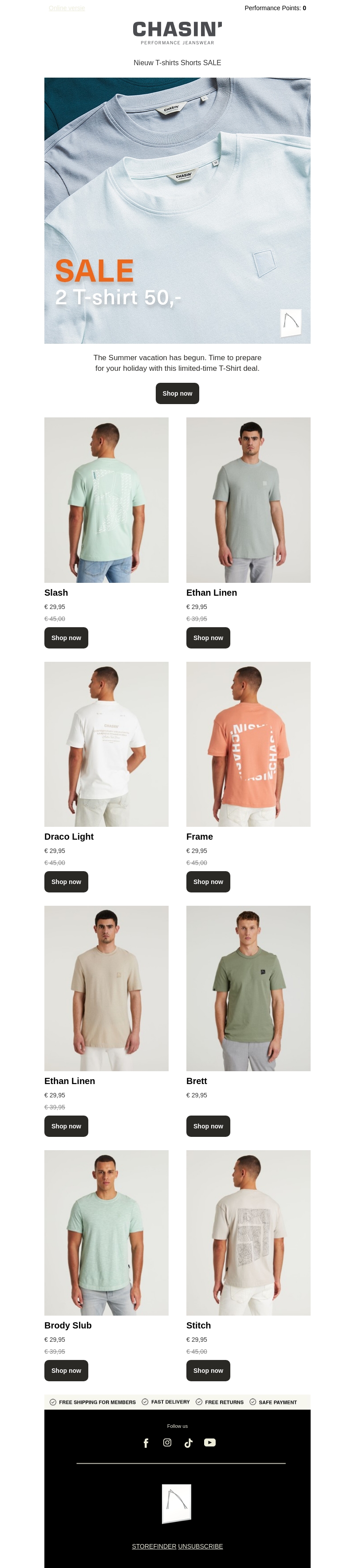 De zomer is begonnen en het is tijd om je garderobe aan te vullen. Profiteer nu van onze speciale aanbieding: 2 T-shirts voor slechts €50. Diverse stijlen en kleuren beschikbaar. Wees er snel bij voordat de voorraad op is!