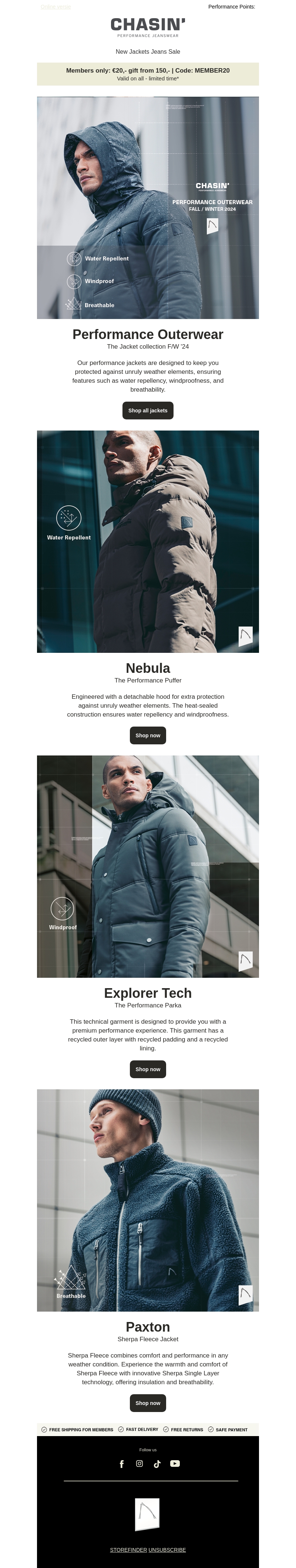Bereid je voor op het seizoen met de nieuwe Performance Outerwear collectie van CHASIN'. Van waterafstotende parka's tot ademende fleece jassen, deze collectie biedt stijl en bescherming. Exclusief voor leden: ontvang een korting van €20 bij bestedingen vanaf €150 met de code MEMBER20. Ontdek een scala aan innovatieve materialen voor ultieme comfort en prestatie. Beperk je niet tot comfort, kies voor de perfecte buitenlaag.