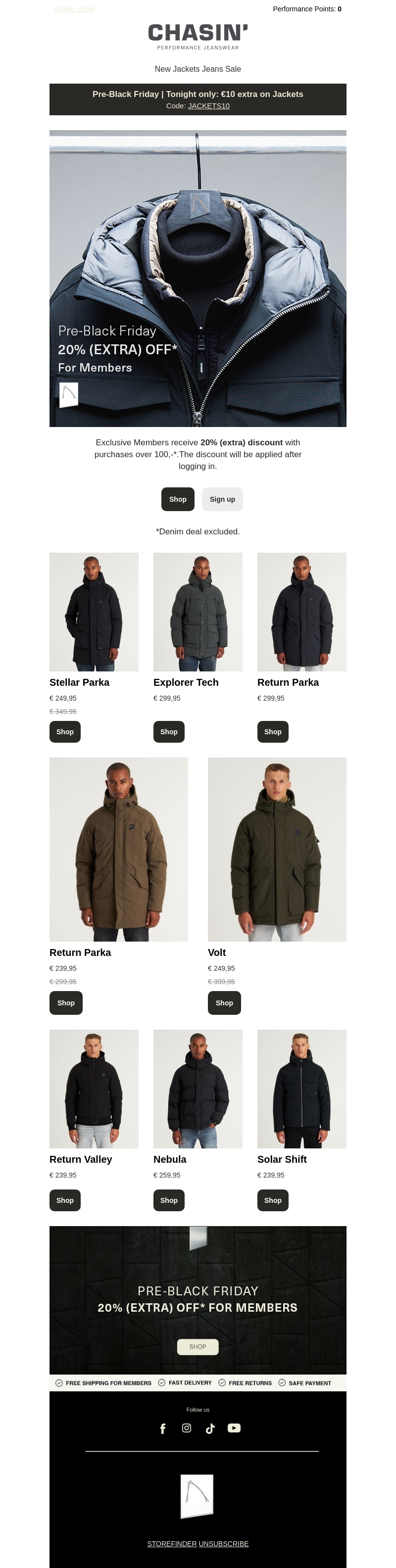 Mis de kans niet om je favoriete jas aan te schaffen met €10 extra korting, speciaal voor vanavond. De Pre-Black Friday actie geldt op verschillende stijlen zoals parka's en tech-jassen. Exclusieve leden profiteren van 20% extra korting bij een besteding boven de €100. Zorg dat je inlogt om de korting te verkrijgen. Let op: denim deals zijn uitgesloten van deze aanbieding.