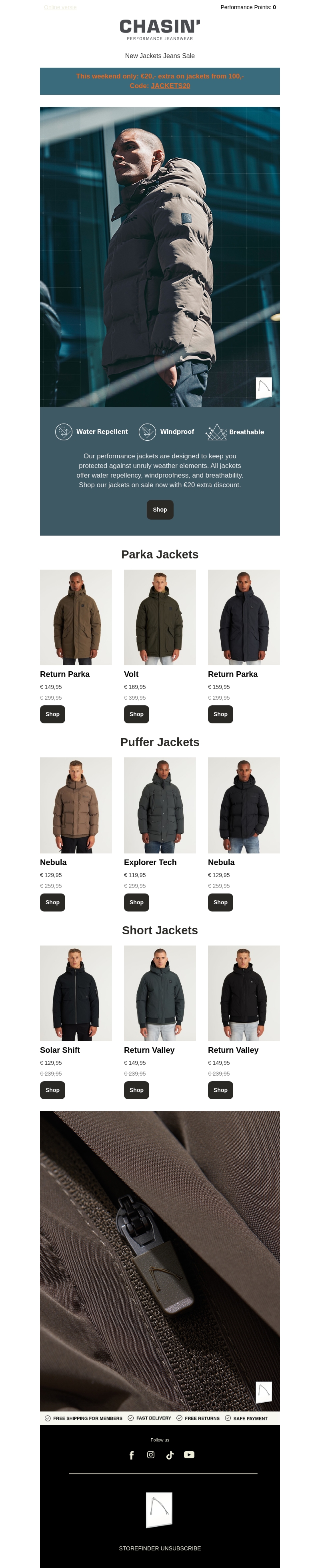 Welkom bij Chasin's grote uitverkoop van performance jassen! Ontvang tot wel 50% korting op onze weerbestendige jassen. Deze jassen zijn waterafstotend, winddicht en ademend. Gebruik de code JACKETS20 voor een extra €20 korting bij besteding vanaf €100. Mis deze geweldige kans niet om jezelf te beschermen tegen elk weertype!