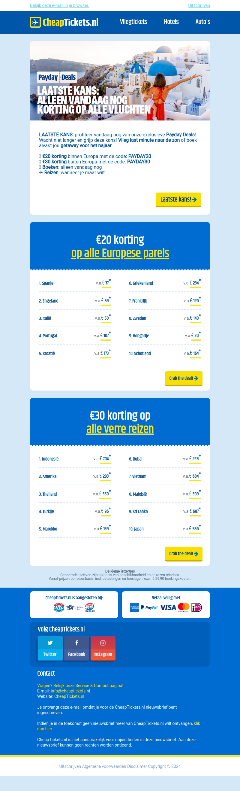 LAATSTE KANS: Profiteer vandaag nog van onze exclusieve Payday Deals! Krijg korting tot €20 binnen Europa en tot €30 buiten Europa. Boek je last-minute vlucht naar de zon of plan je herfst getaway nu. Codes: PAYDAY20 voor Europa en PAYDAY30 voor buiten Europa.
