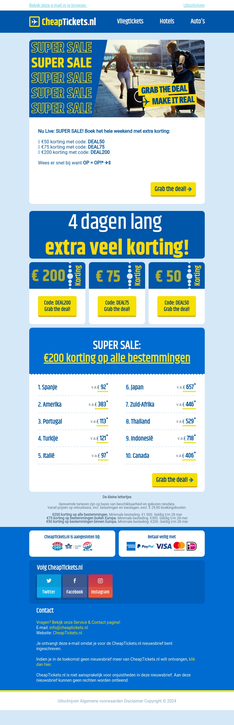 Profiteer nu van de Super Sale bij CheapTickets.nl met kortingen tot wel €200 op reizen over de hele wereld. Gebruik de speciale kortingscodes DEAL50, DEAL75 of DEAL200 om jouw korting te claimen. Let op, de actie is beperkt beschikbaar, dus wees er snel bij!