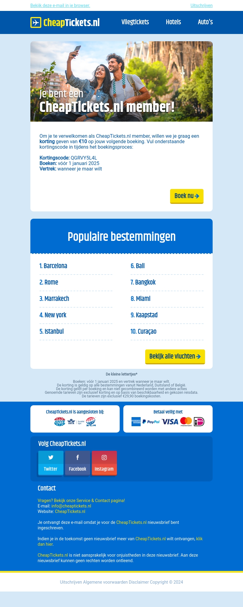 Ontvang €10 korting op je volgende boeking bij CheapTickets.nl en geniet van exclusieve ledenvoordelen. Boek voor 1 januari 2025 en vertrek wanneer je wilt. Ontdek populaire bestemmingen zoals Barcelona, Rome en Bali.
